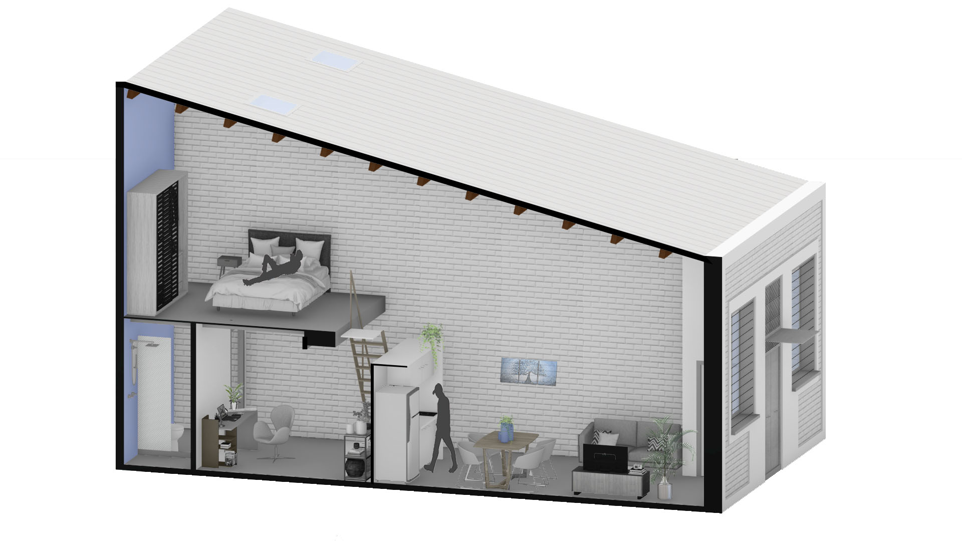 Un antiguo almacén situado en un pasaje de l'Eixample de Barcelona, se reconvierte en dos viviendas tipo lofts independientes. En la planta baja se plantea la zona de día, abierta, un salón comedor a doble altura, cocina tipo office, y una pequeña zona de estudio o para dormir y el baño en la medianera posterior. Aprovechando la doble altura de la zona más alta de la cubierta inclinada, se propone un altillo con el dormitorio.